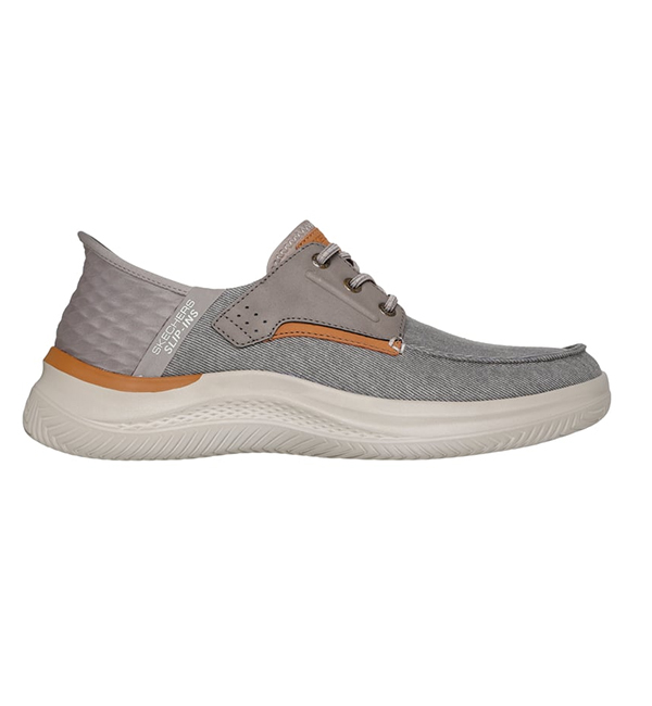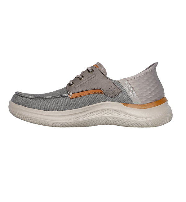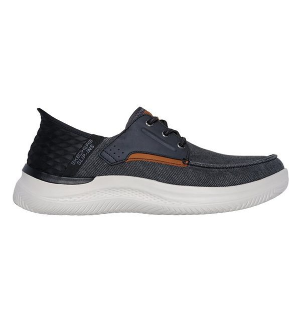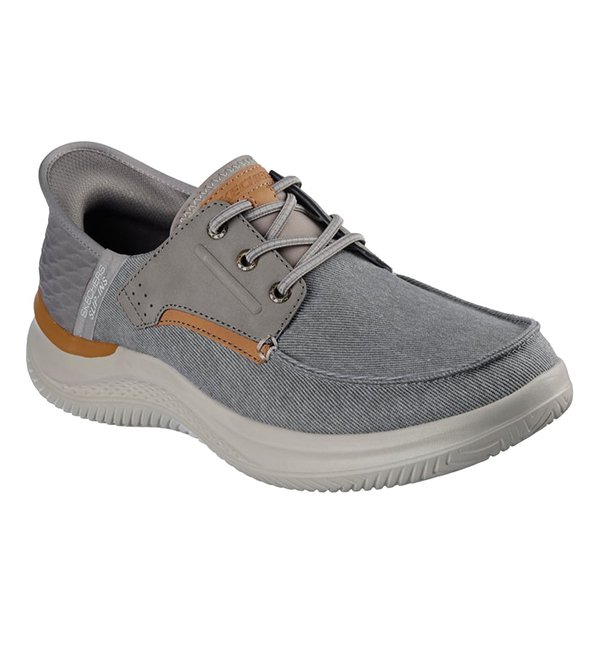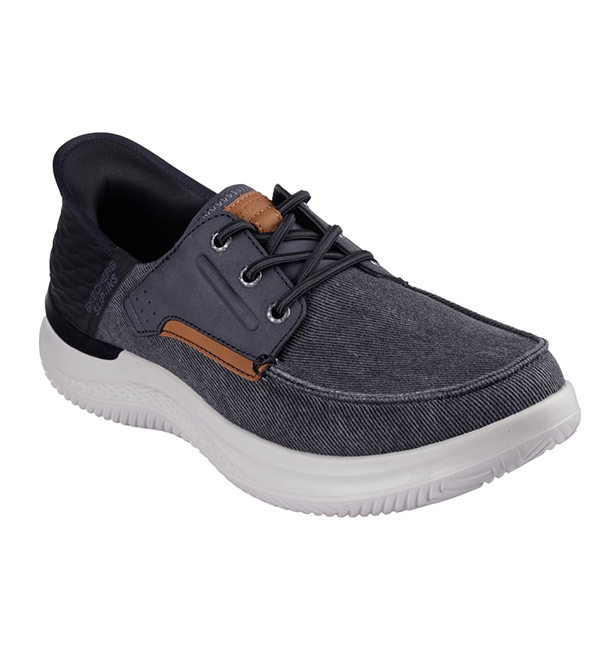 Experience casual comfort for your daily life wearing Skechers Hands Free Slip-ins® Relaxed Fit®: Hasting - Niko. This vegan moc toe loafer features a roomy canvas and synthetic trimmed upper with stretch laces and a cushioned Air-Cooled Memory Foam® insole.