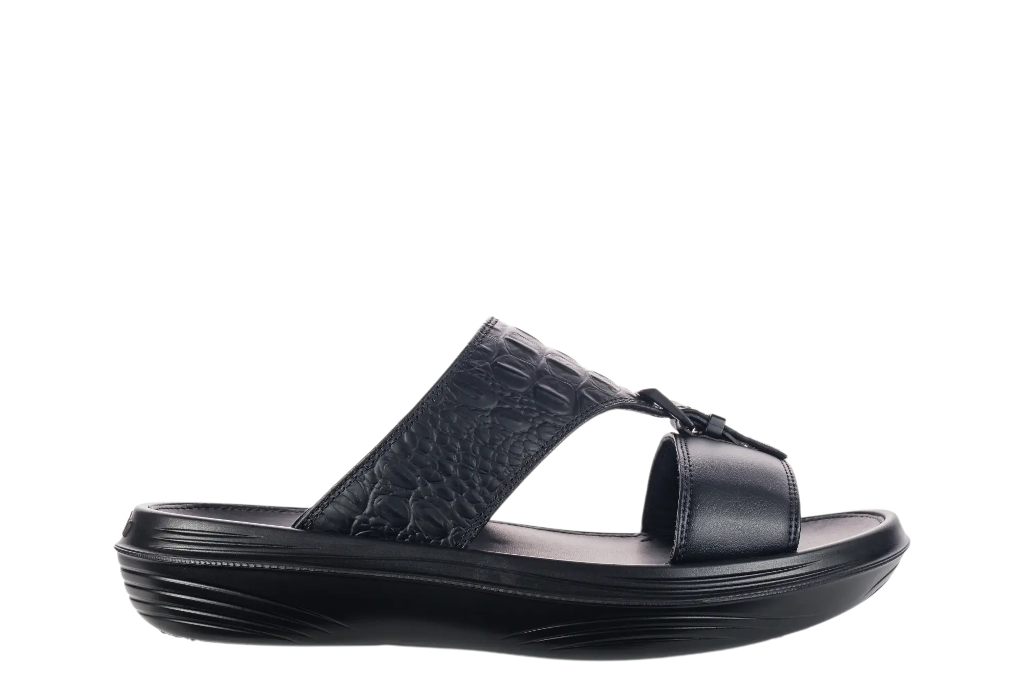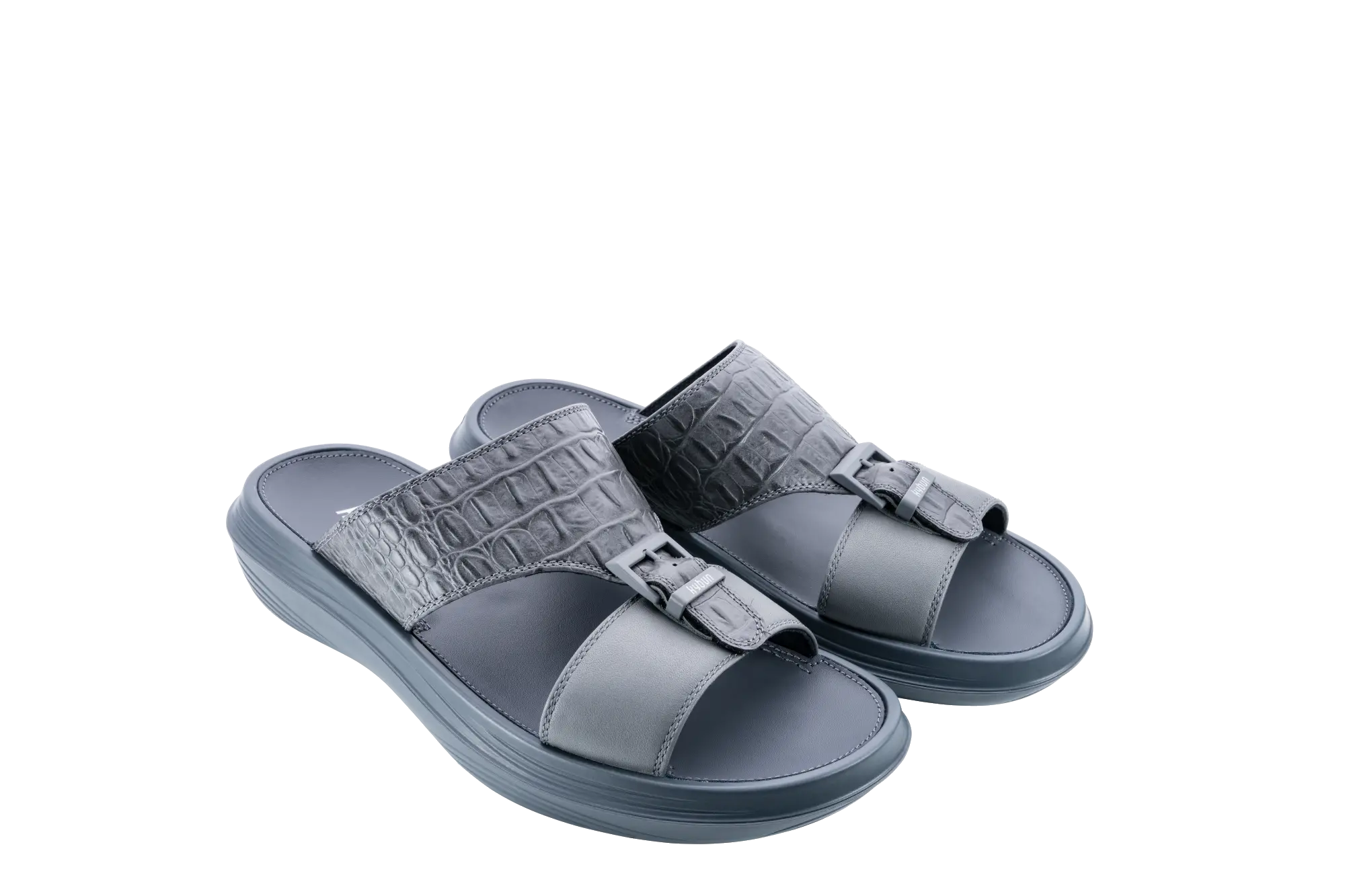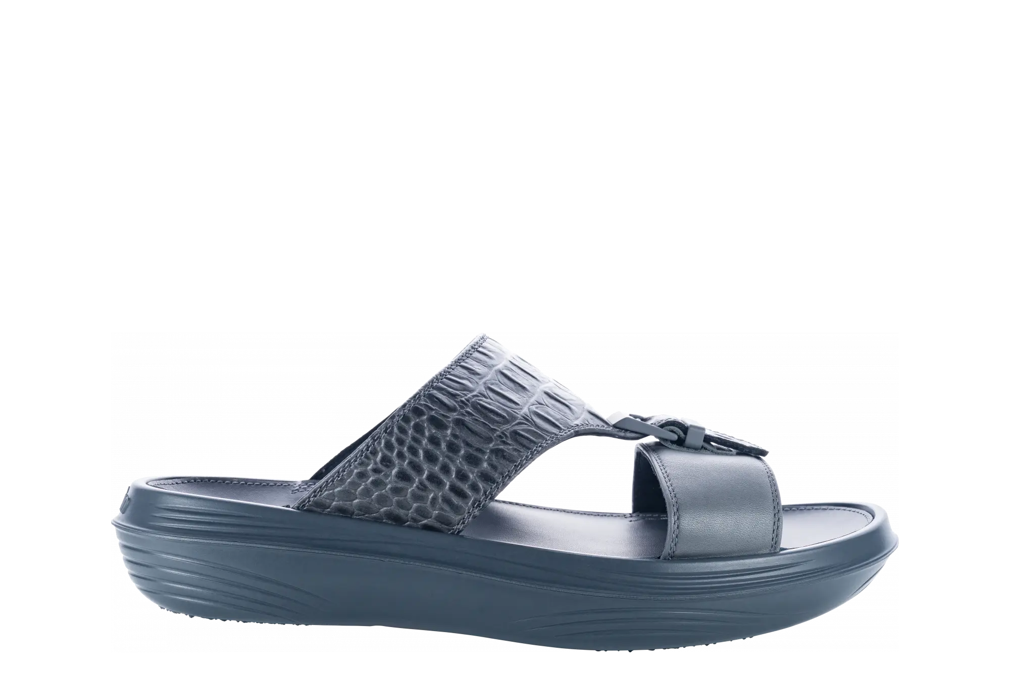 A sophisticated slide sandal crafted from full-grain leather, featuring a rich, crocodile-embossed leather strap and smooth, modern, tonal buckle detailing. A timeless design with a contemporary twist. Equipped with our unique Swiss air-cushioned Strato sole with high rebound effect, providing an exceptionally soft walking experience while relieving pressure on joints and back, stimulating health-promoting receptors in the feet, and strengthening muscles with every step.