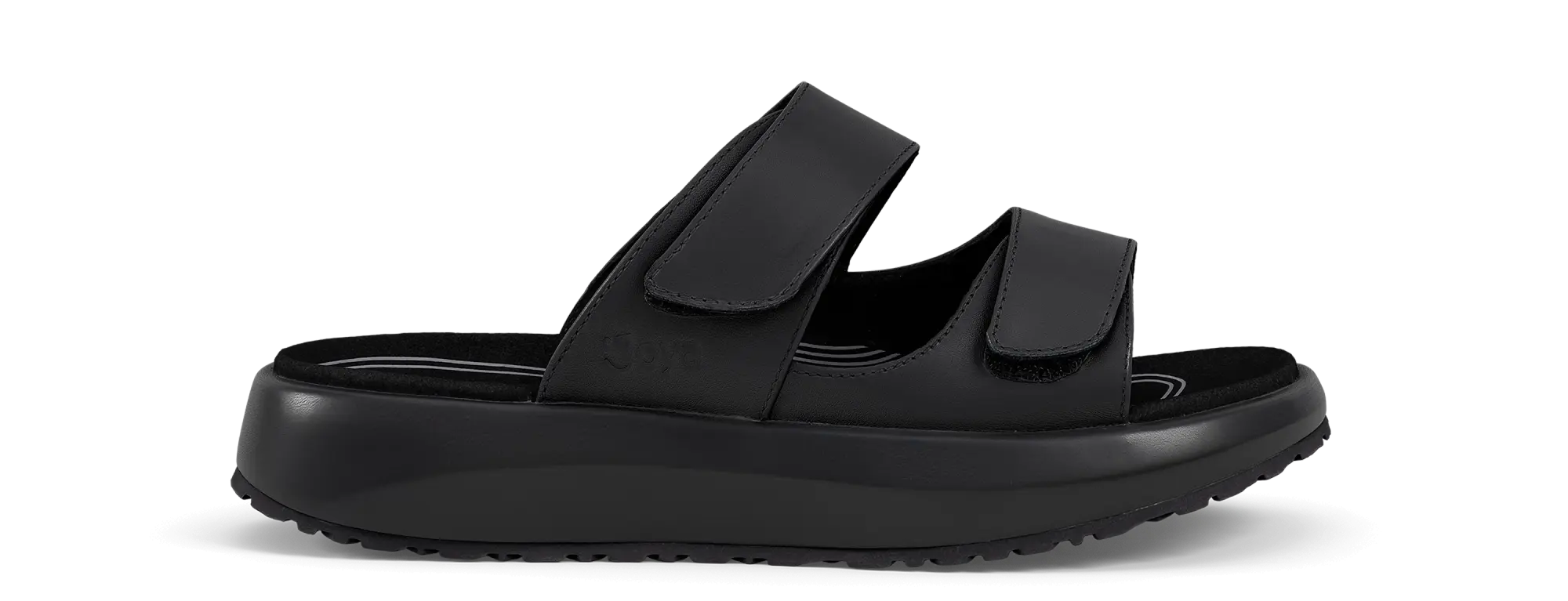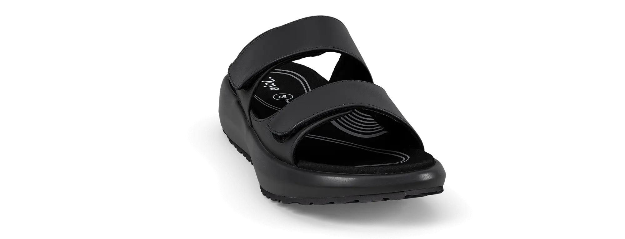 The perfect everyday companion for comfort: Vienna III black. This sandal, crafted from premium nubuck leather, features two straps with hook-and-loop closures for easy on and off and a fit that can be easily adjusted as needed. A soft microfiber lining and insole ensure a comfortable feel, while the abrasion-resistant rubber outsole provides reliable grip. Joya Senso sole technology cushions every step, distributes pressure evenly, and noticeably relieves strain on your back, joints, and feet.